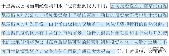 巴特,计划总是赶不上变化。2001年报称,招股说明书原计划的募投项目都不算数了,“绿色家园”的五大项目全部终止,国旅联合把资金全部集中用于汤山温泉度假区的开发建设。见下方截图: