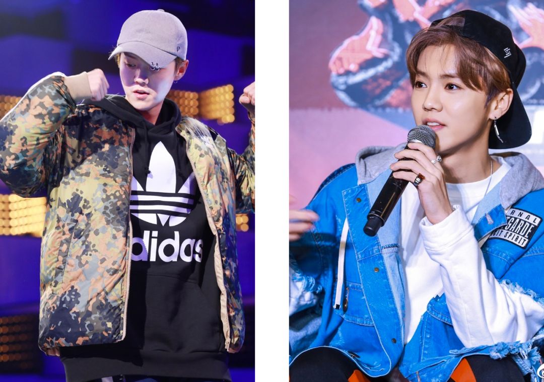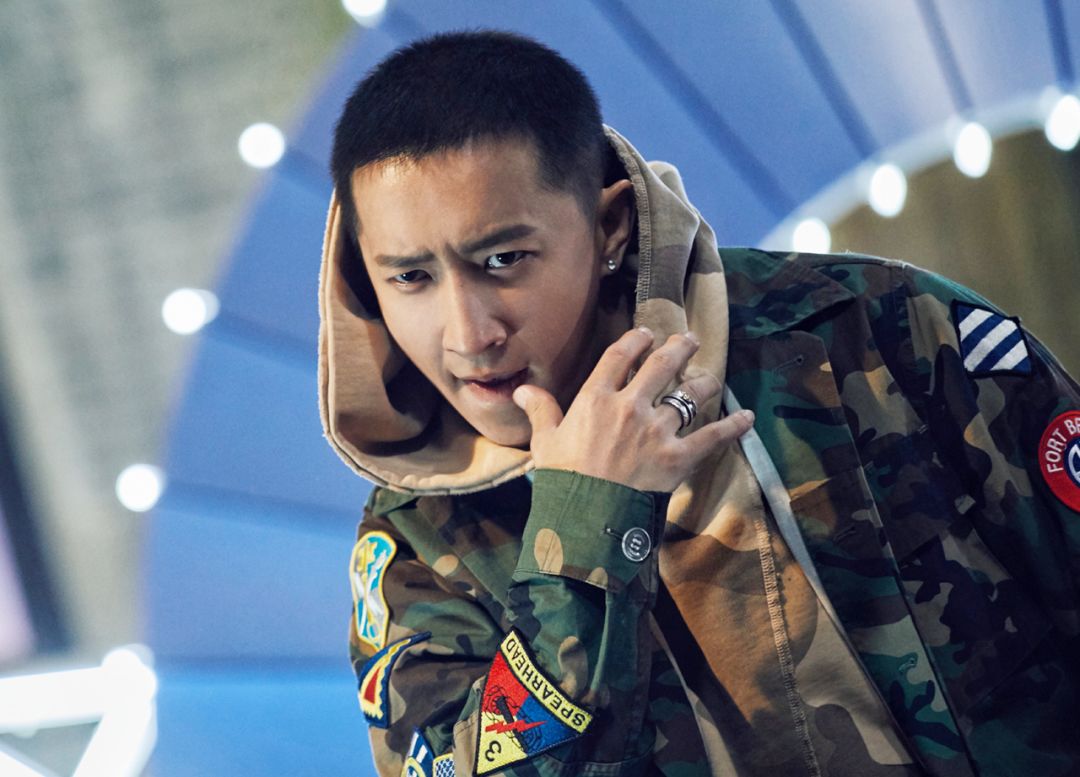 韩庚这种内外都是迷彩的造型有点挑人,如果想借鉴他这种造型,建议一定要和他一样,内搭挑比外套浅一些的款式,否则上半身会很厚重。