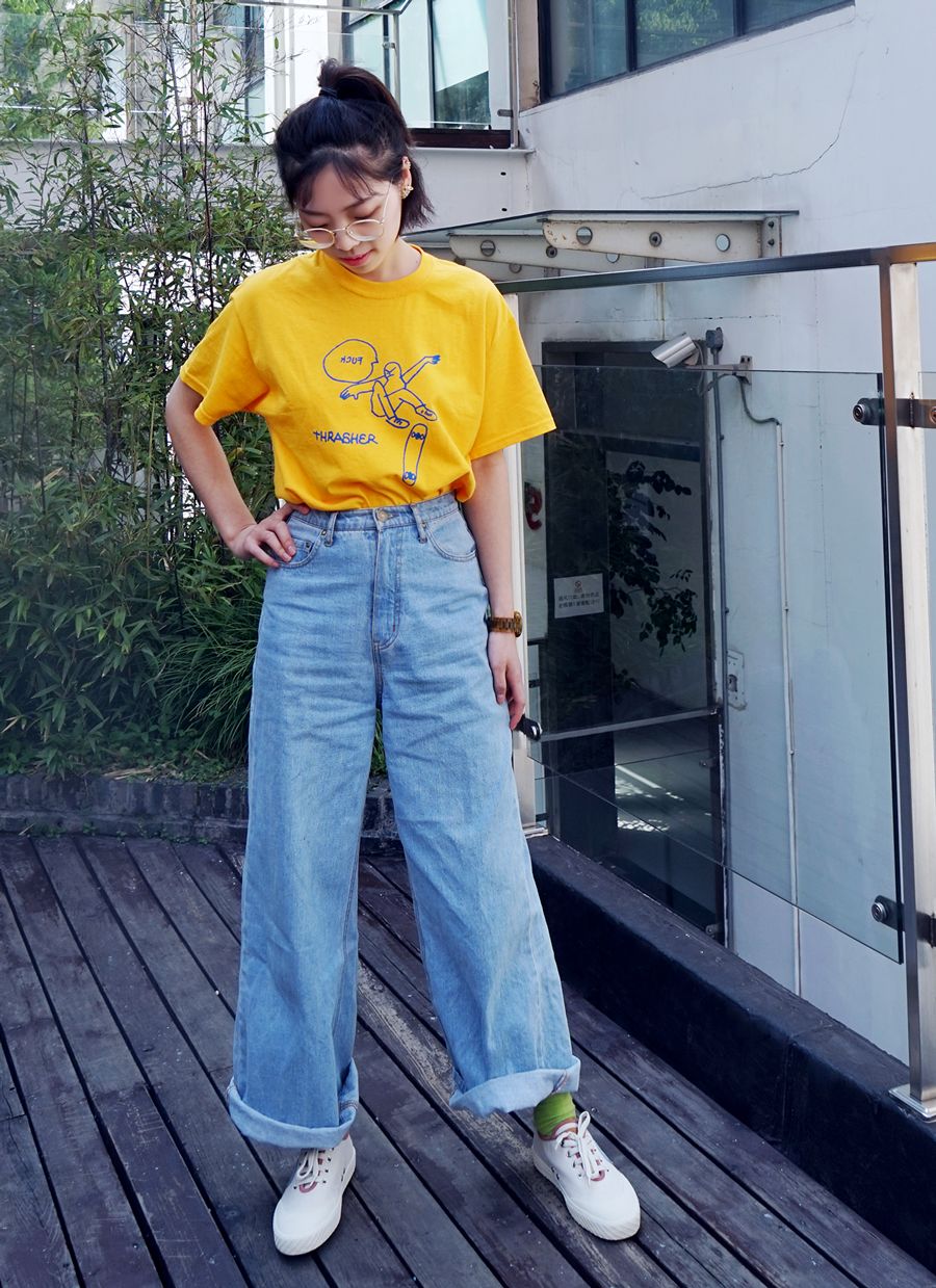 这双鞋真的很好搭。可以像我们公司的Zixin一样,搭配阔腿牛仔裤穿,很显腿瘦。