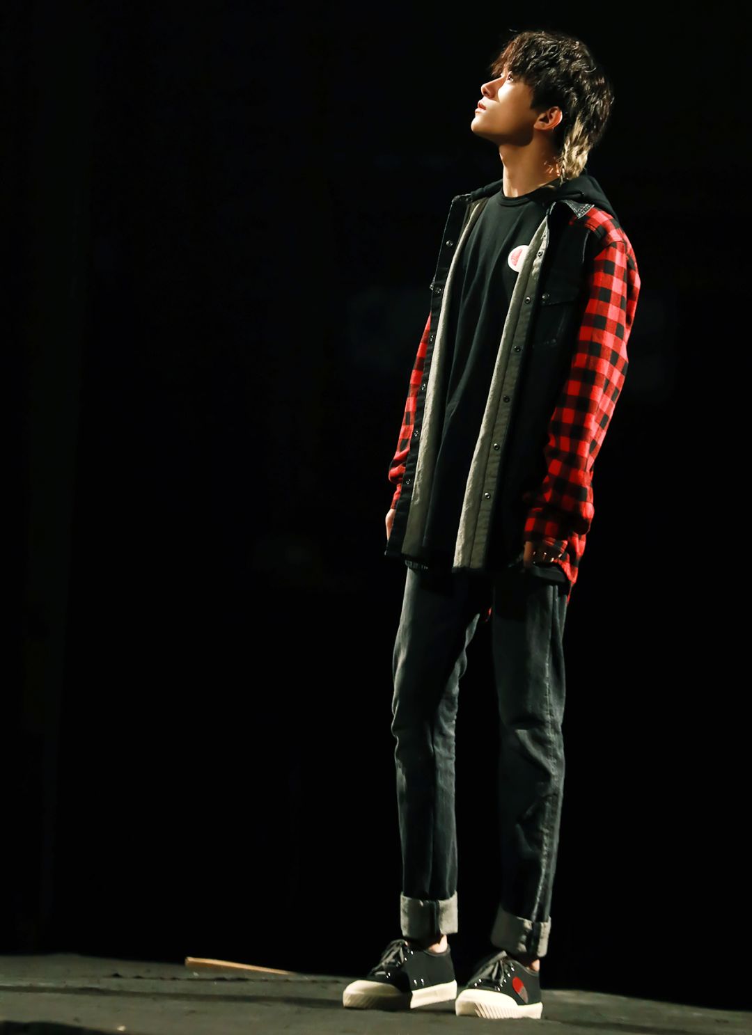 白色的连帽卫衣让整个造型看上去不会太红,很有层次感。如果平时自己穿的话,也可以参考他这样的黑白红色彩组合来挑款式叠搭。