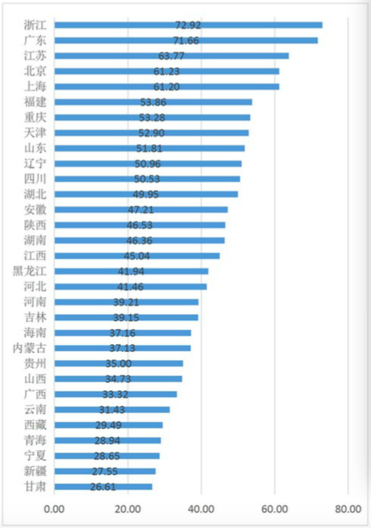 《报告》显示,绿色发展综合得分呈从东南沿海向西向北逐渐递减的态势,东部沿海地区绿色发展优势明显,高值的省份和城市主要分布在沿海地区,低值的省份和城市大多分布在北方内陆地区。在省区尺度上,浙江、广东、江苏名列前三甲,在城市尺度上,深圳、杭州、北京、广州、上海名列前五名。