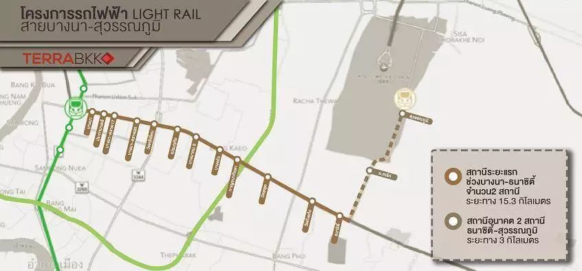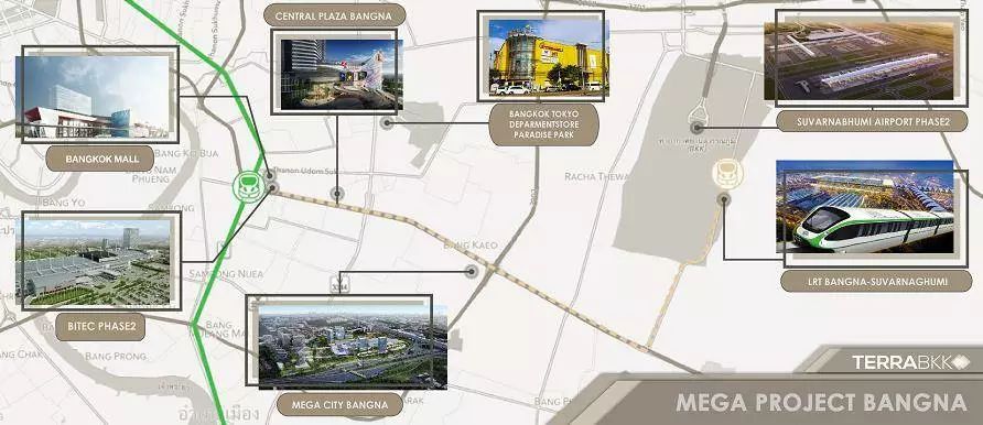 作为东边经济出口,项目周边黄线(Yellow Line)和浅绿线(Light Trail)已经在建设当中,分别在2021和2023年竣工通行,项目所在地将收益成为曼谷新兴的商务拓展区EBD(Extend Business District),升值潜力无可估量!同时受益于yellow line和light trail的开建,将会承接更大的交通和区位地位。上图显示的Light Trail是连接Bangna和机场素万那普的快速通行铁路,起到极大的分流和直达的作用。