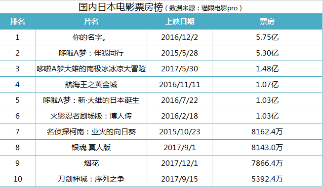 在国内的日本电影票房排行榜前十中,有九部是动画电影,其中唯一一部真人影片还是动漫的真人翻拍。这情况的确是日本电影圈独有的。