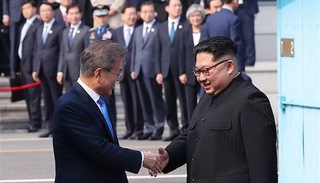 首尔时间9时30分许(北京时间8时30分许),金正恩在板门店跨过军事分界线,进入韩方一侧,受到等候在那里的文在寅欢迎。