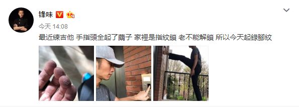 今日,谢霆锋更新微博表示:“最近练吉他,手指头全起了茧子,家里是指纹锁,老不能解锁,所以今天起录脚纹。”照片中,谢霆锋“脑洞”大开,将脚抬到门口的解锁处,认真的表情逗趣可爱。
