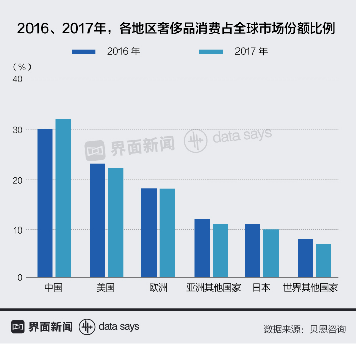 另据贝恩咨询发布《中国奢侈品市场研究》,中国不仅为全球最大的奢侈品消费国,且与其他国家已拉开较大差距。