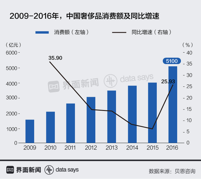 中国已成为全球奢侈品消费的引领者,2010年至2015年中,中国奢侈品市场的销售额从2120亿美元增长到5100亿美元,2016年的上升则更为显著,一举超过过去五年的复合增长率。