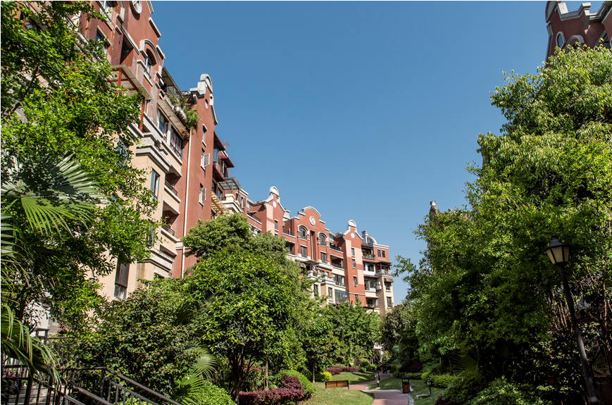 即使用十一年后的眼光来看,朗香郡在社区规划,在建筑、景观的设计上依然可圈可点:洋房组团有大面积的景观,植被茂盛、小桥流水,步道蜿蜒其间,居住舒适度很高。