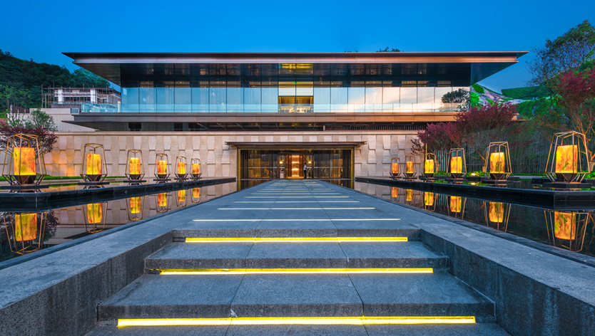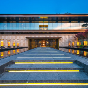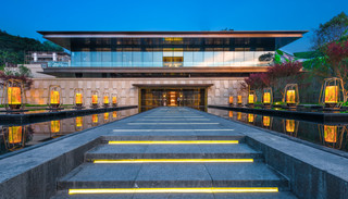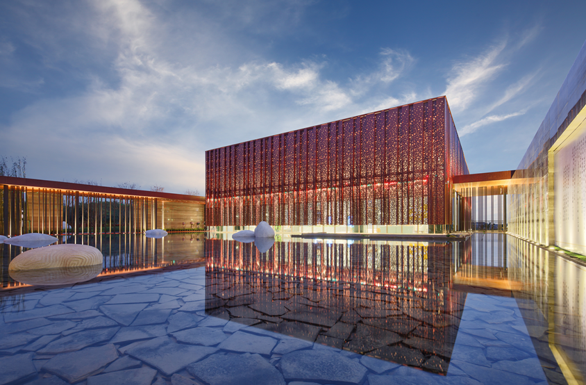 御璟湖山的示范区没有用这两年流行的新中式设计,而是运用现代简洁的设计语言来诠释:外墙采用铁锈红色的凹凸铝板,以山茶花纹装饰,通过三种不同规格标准型版交错布局,呈现节奏与韵律。示范区大量运用连廊、水景,以及小桥流水曲径通幽的园林景观,传递项目对自然环境的尊重。