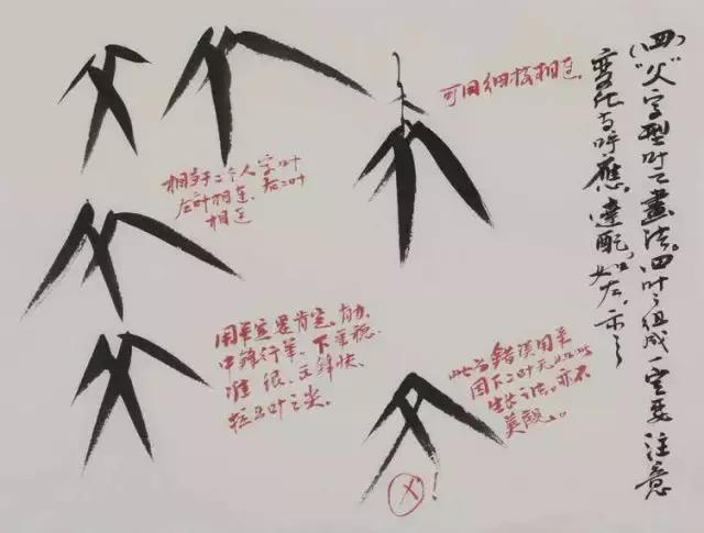 “分”字叶为四连贯排列的叶片,注意四笔的节奏与关联,长短与大小。但板桥作中无此造型。