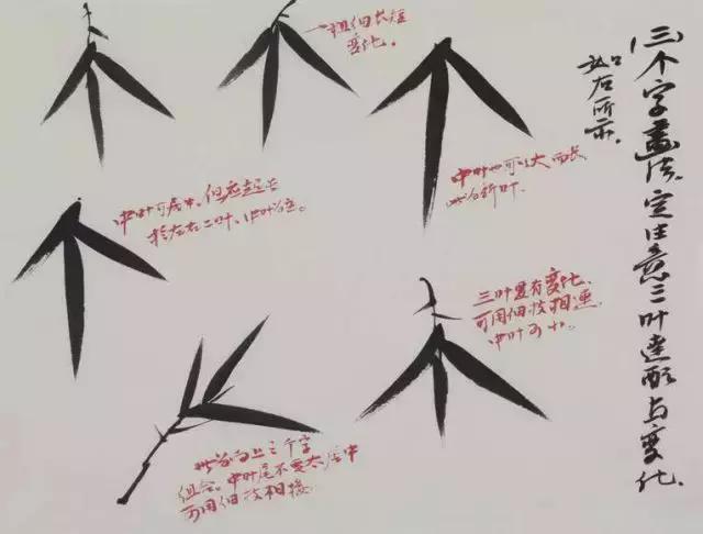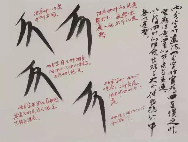 “人”字与“个”字叶的组合,注意五叶的大小长短、粗细变化。