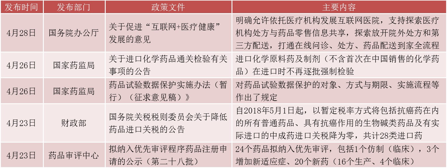 本周行业政策涉及互联网医院、进口化学药检验、药品试验数据保护、进口药零关税、优先审评审批等方面。4月28日,国务院办公厅正式发布《关于促进“互联网+医疗健康”发展的意见》,明确允许依托医疗机构发展互联网医院,逐步将符合条件的互联网诊疗服务纳入医保支付范围,对线上开具的常见病、慢性病处方,经药师审核后,医疗机构、药品经营企业可委托符合条件的第三方机构配送。这将有利于促进互联网医院的发展,拓展医院业务范围和服务半径,同时也可以满足患者的多元化和便利性需求。