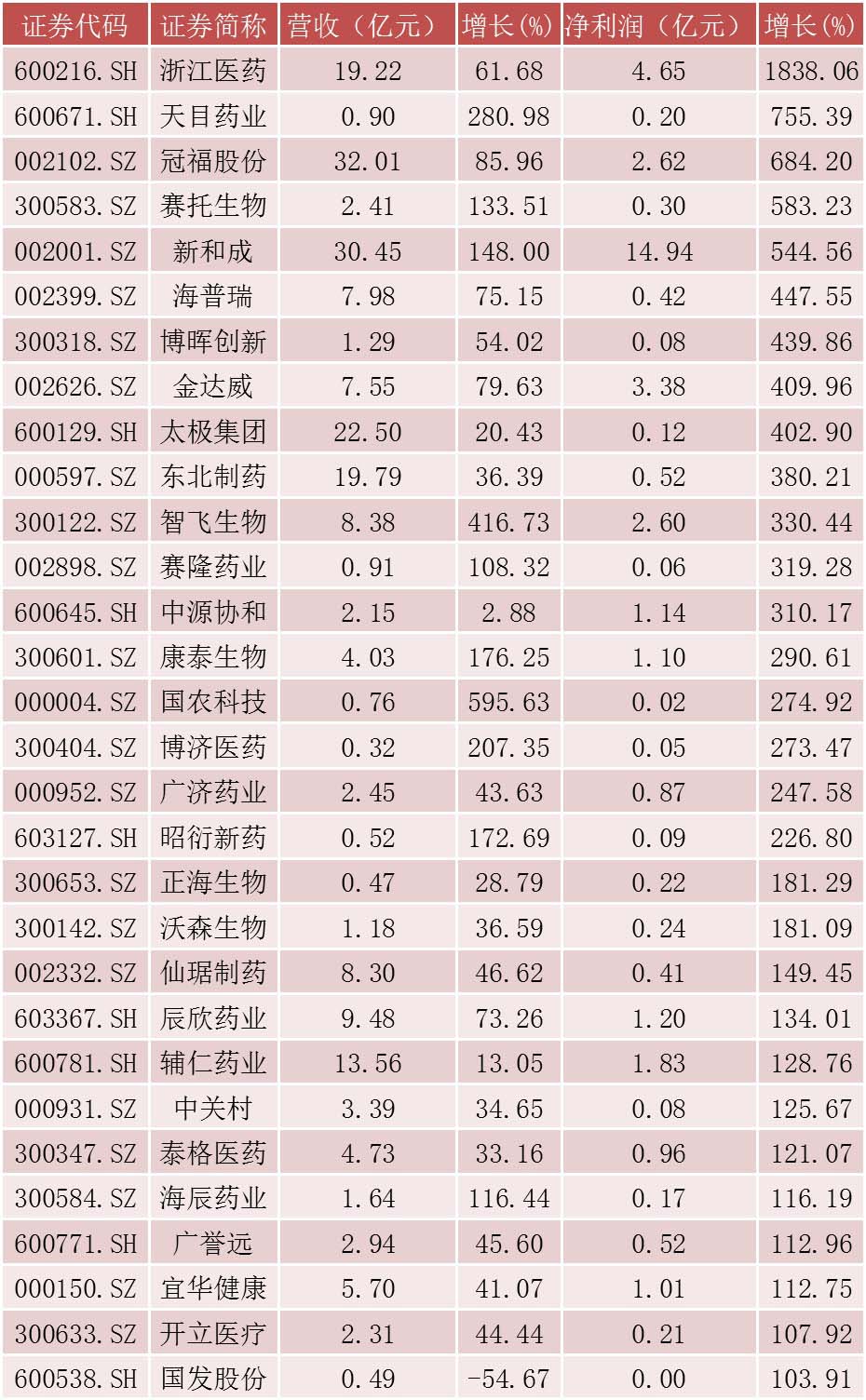 在实现增长的企业中,有30家净利润实现翻倍增长,其中浙江医药(600216.SH)增长最为迅猛,涨幅高达1838%;天目药业(600671.SH)和冠福股份(002102.SZ)分别次之,涨幅分别达到755%、684%。在按Wind分类,这三家企业今年净利润涨幅也居于279家A股上市药企前三甲。