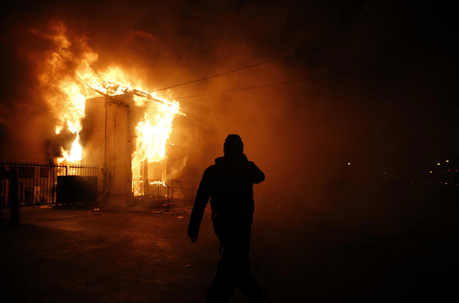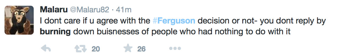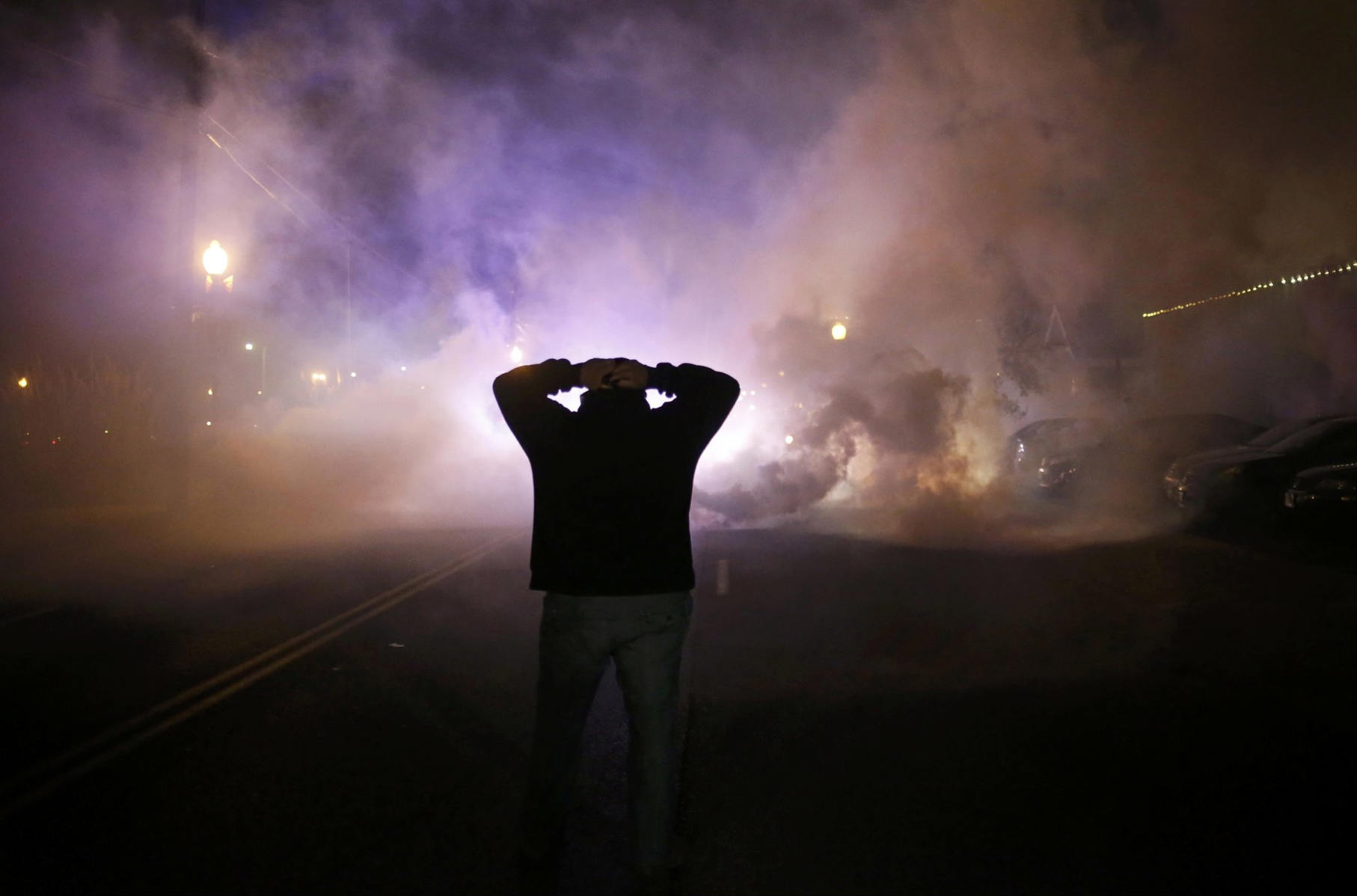 结果公布后,当地再次发生了严重的冲突:弗格森警察局外立即聚集了成百名抗议者。人们拿着标语,喊着口号,并向警察投掷石块和玻璃瓶。在市中心,有店铺的玻璃被砸,至少数辆警车被点燃,很多商店——包括一家Walgreens、一家肉铺、还有一处仓库都被烧,部分店家报告遭到洗劫。为控制群众,警方使用了催泪弹。
