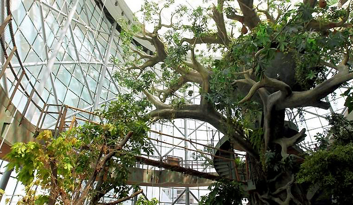 当然,最令人意外的还要属Green Planet:一座人工模拟的室内垂直热带雨林生态系统,从成片郁郁葱葱的热带植被,到热带雨林动物,再到700%的湿度,The Green Planet模拟了真实的热带雨林场景。据说,共有超过3000种动、植物在这里安家:南美的箭毒蛙藏在树叶下,蓝色的金刚鹦鹉在枝头嬉闹,树懒在树丛中灵活地攀上爬下,比《疯狂动物城》里动作缓慢、人见人爱的“闪电”看上去灵活多了……