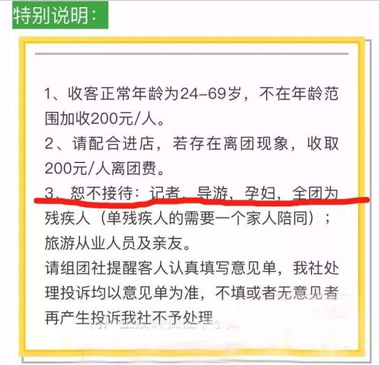 湖南省常德市一家旅行社日前推出一条旅游线路,在该线路的网上宣传中直接打出“恕不接待记者、导游、孕妇”等字样,同时还指出如果游客不进店(购物)将收取200元的“离团费”。