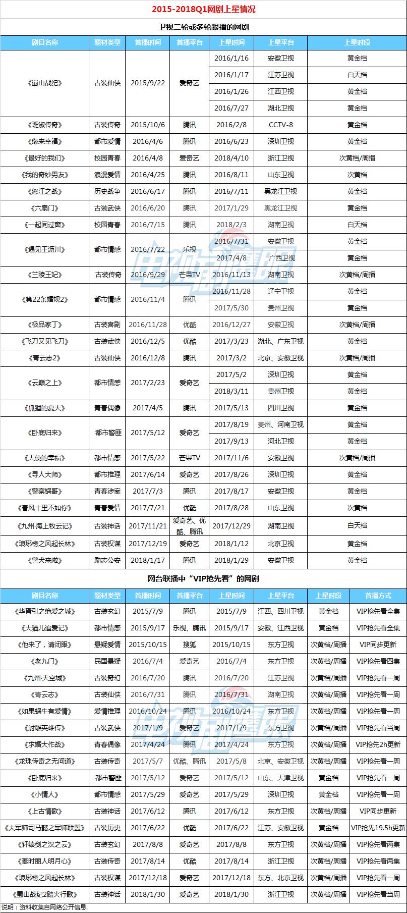 根据表格可发现,网剧上星分为两种形式,一种是先在网络播出,卫视二轮或多轮跟播;另一种是网台联播,同时网络采用“VIP提前看”策略,保证优先权。