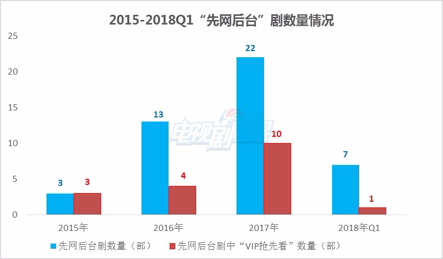 根据网剧上星时间,2015年仅3部网剧实现反输卫视,2017年已达到22部,连年递增的数量,直接说明视频网站拥有首播权的电视剧数量在稳步上升。