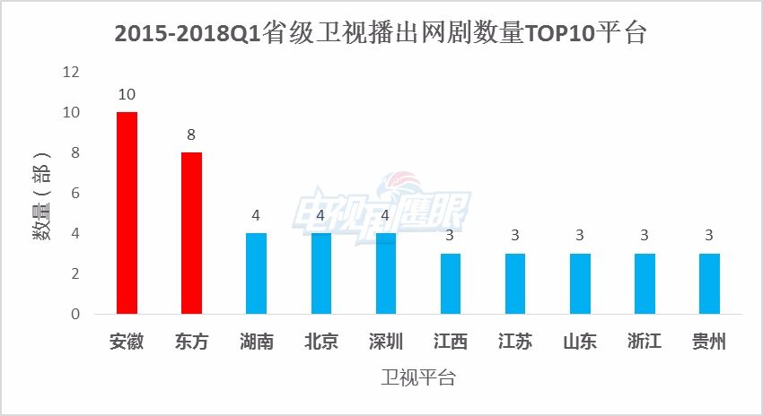 根据统计,2015-2018Q1,包括央视在内,共有22家卫视排播了网剧。其中,安徽卫视和东方卫视分别以10部和8部占据前两位,并且湖南、东方、北京、江苏、浙江五大一线卫视全部向网剧抛出橄榄枝,一方面证明网剧影响力显著提升,另一方面也侧面反映出,卫视平台在压力之下,正在积极开拓思维,放宽眼界,快速走上创新之路。