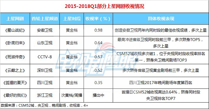 真正让业界认识到网剧上星潜力的当属《蜀山战纪》在卫视播出时的优异战绩——2015年上线爱奇艺的《蜀山战纪》,2016年初反输到安徽卫视黄金档,CSM52城收视多次破1,最终创造了安徽卫视两年来同时段的最佳收视成绩。