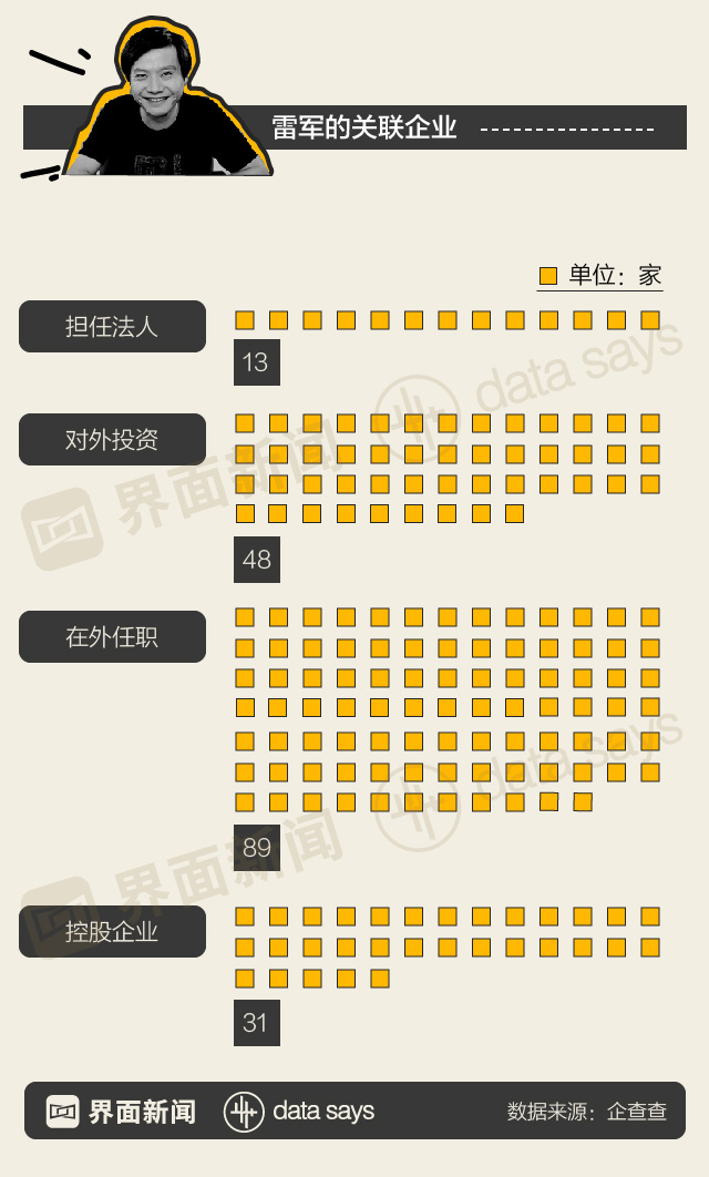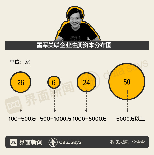 雷军不只有小米。企查查数据显示,由雷军担任法人的企业共有13家,控股企业达31家。与其相关联企业的注册资本多数在5000万以上。