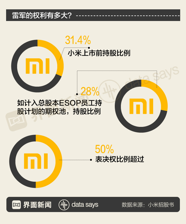 据接近小米IPO中介方的人士透露,眼下保荐人、投行、潜在投资人普遍接受当前估值至少在700亿美元,IPO之后小米市值短期内可能超过1000亿美元。现招股书中揭示小米上市前的持股比例情况,小米的创始人、董事长兼CEO雷军持股31.41%。计入总股本ESOP员工持股计划的期权池后,持股比例为28%。也就是说雷军仍旧无法取代拥有2950亿元人民币资产的马化腾,成为中国首富。