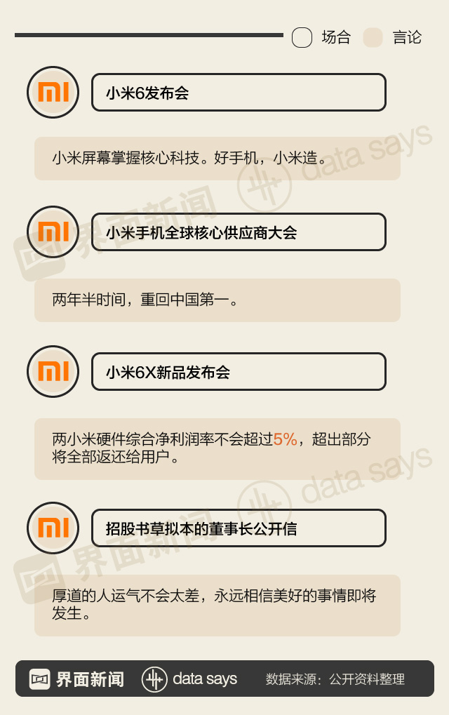 雷军在招股书草拟本的董事长公开信最后表示“厚道的人运气不会太差,永远相信美好的事情即将发生”。在公开场合的发言中,类似口号时常出现。