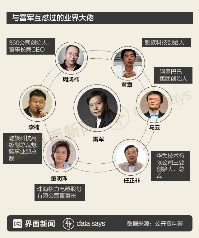 此外,雷军与其他业界大佬的互怼也经常成为媒体竞相报道的焦点。比如说和珠海格力电器股份有限公司董事长董明珠间的互怼,已持续近5年。