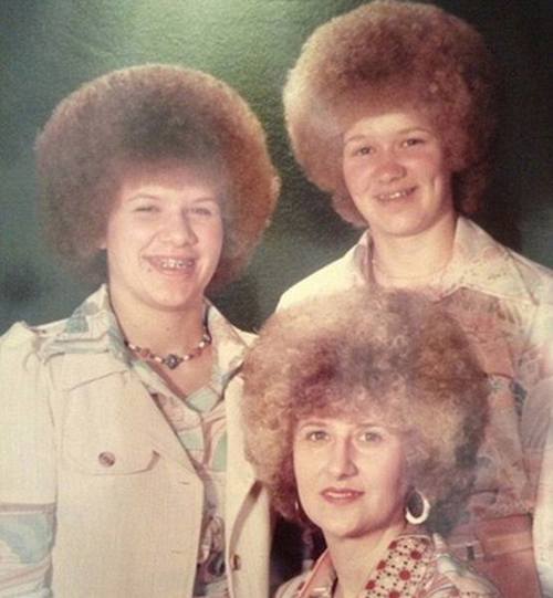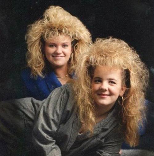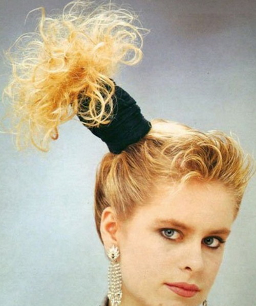 80年代的女式发型特别夸张,摇滚范儿蓬蓬头十分流行,女性会将少量短刘海随意的散落在额前,剩下的头发则全部向后吹并向上翻起,吹得越高越好。
