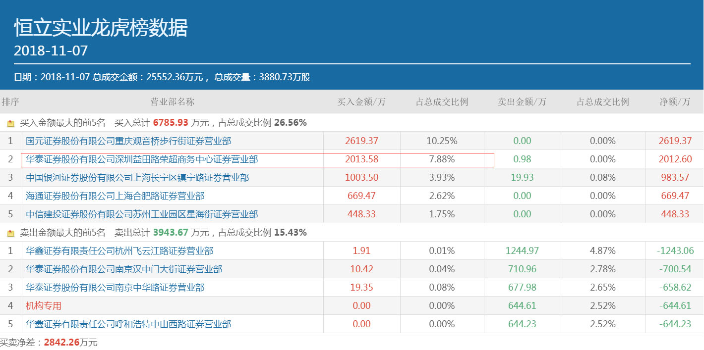 而在前一天,华泰证券深圳益田路荣超商务中心就曾位居恒立实业3日龙虎榜买一的位置,买入额为3826.14万元。