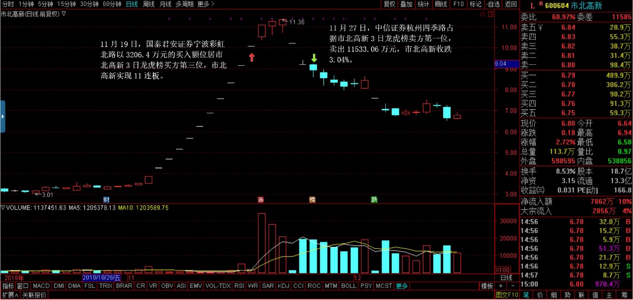 数据显示,在市北高新本轮暴涨中,章建平两次登上该股龙虎榜,分别是:11月19日,国泰君安证券宁波彩虹北路买入3206.4万元;11月27日,中信证券杭州四季路卖出11533.06万元。