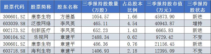 值得注意的是,被章建平看上的还不止海利生物。界面新闻梳理了三季报章建平及其一致行动人现身上市公司前十大股东的情况: