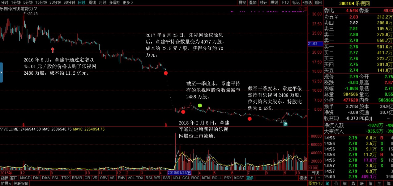 乐视网并非孤例。章建平同年花费9.6亿元参与联络互动(002280.SZ)定增,进入成本为11.34元/股,退出时股价则介于10.84元-11.59元/股之间,一年无用功。