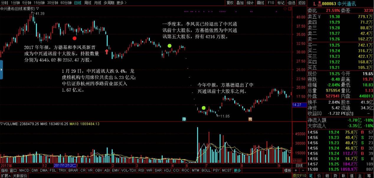 中兴通讯并未给章建平带来期望的结果。2018年6月13日,停牌两个月的中兴通讯终于复牌,章建平也借助通道优势,含泪割肉出货。截至18年中报,方基德退出了中兴通讯前十大股东之列。在此期间,中兴通讯连接遭遇八个跌停板,开板后股价也处于阶段底部,章建平继踩雷乐视网之后,又一次损失惨重。