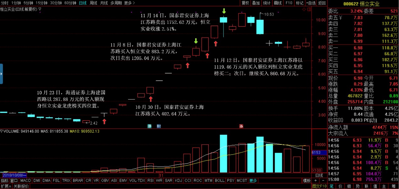 10月23日,章建平旗下的海通证券上海建国西路便以287.88万元的买入额占据恒立实业当日龙虎榜买四的位置,此后亦曾多次上榜,直至11月14日,国泰君安证券上海江苏路卖出1752.62万元,恒立实业二次开板,收涨2.51%,而此时其股价距离本轮上涨行情的顶部已经不远了。