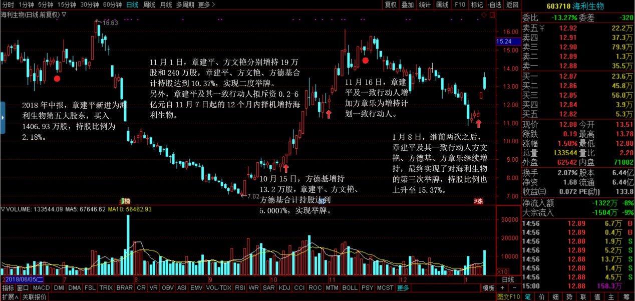 2019年1月8日,章建平及其一致行动人方文艳、方德基、方章乐继续增持,完成了对海利生物的第三次举牌,持股比例也上升至15.37%。