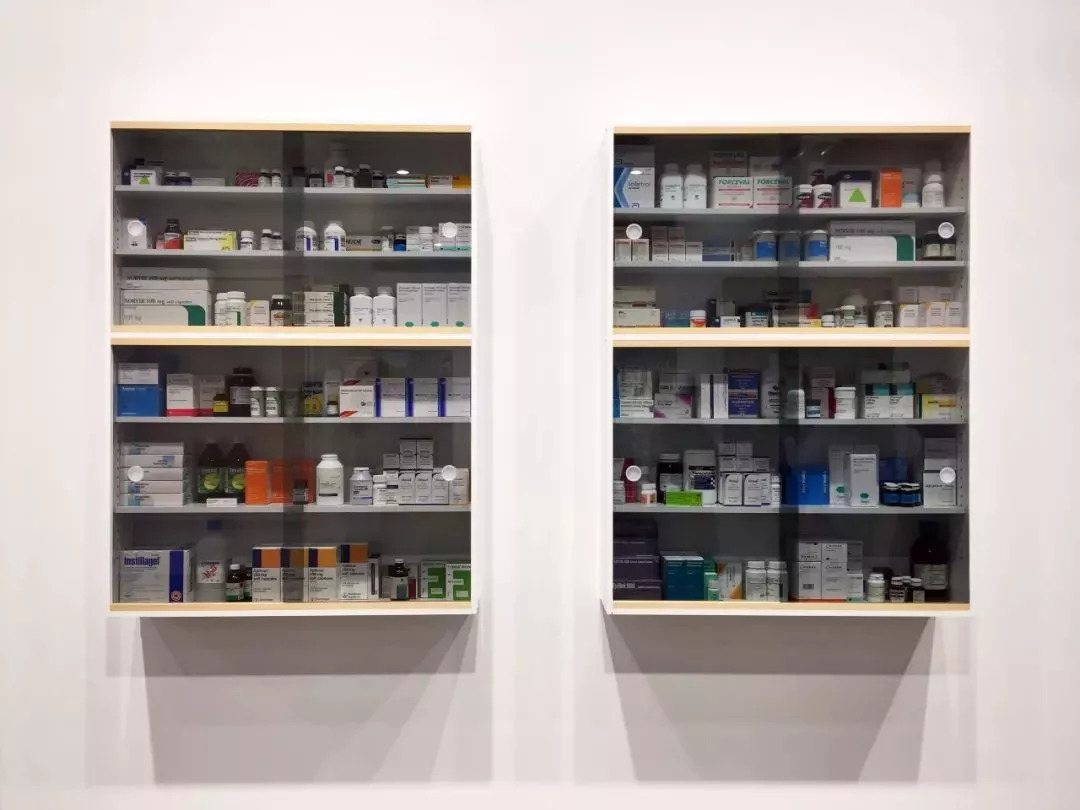 Damien Hirst, Twixt the Gloomand the Gleam,2006, Gloss, steel, MDF, aluminium and drug packaging,Two cabinets. Each:137.2×101.6×22.9 cm,White Cube