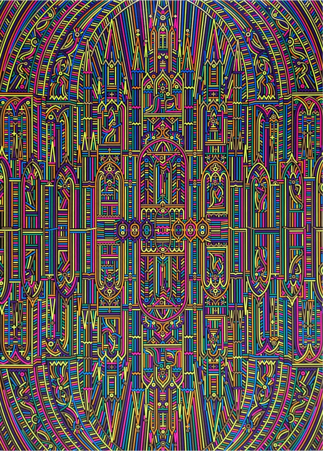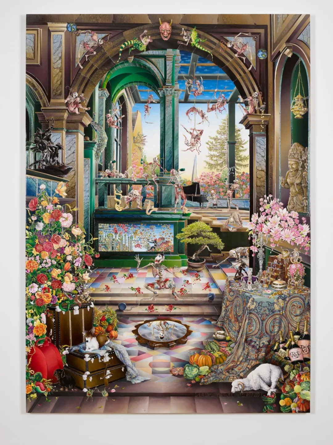 Raqib Shaw, Self Portrait in the Studio at Peckham (After Steenwyck the Younger) II, 2014 – 2015, Acrylic liner, enamel and rhinestones on birchwood, 213.4 × 152.3 cm, White Cube