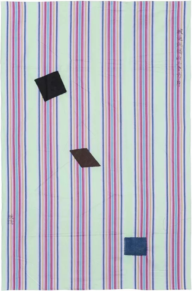 廖国核,《被逼跳楼的三个方片(块)》,2017,织物丙烯,160x109 cm,博而励画廊