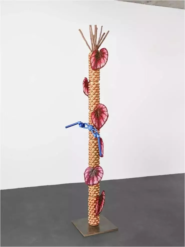 关小,Bamboo, 2017,Steel, brass, acrylic paint, resin, metal motorcycle handles,artificial leaves,230 x53x53 cm,天线空间