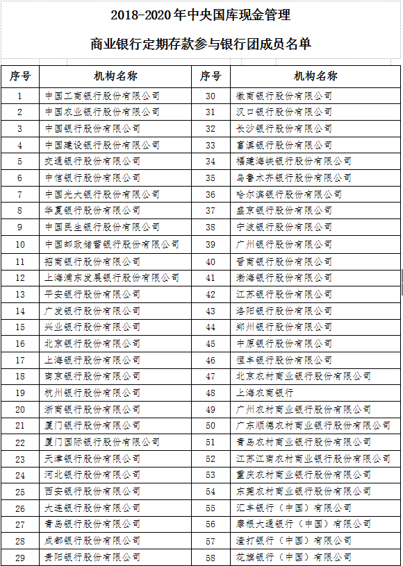 日前,财政部联合中国人民银行发布《关于确认2018-2020年中央国库现金管理商业银行定期存款参与银行团成员名单的通知》(下称通知)。通知显示,财政部会同人民银行确定了2018-2020中央国库现金管理商业银行定期存款参与银行团成员名单,工商银行、农业银行、中国银行、建设银行、交通银行等58家银行入围。