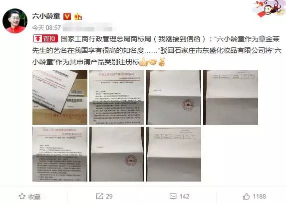 5月7日,六小龄童在微博晒出其收到的一封国家工商行政管理总局商标局(以下简称商标局)信函,显示针对六小龄童对某化妆品公司的“六小龄童”商标提出异议的问题,商标局驳回了该化妆品公司的商标注册申请,认为该行为侵犯了六小龄童姓名权。为此,他在微博直接用“点赞”“握手”“胜利”三个表情表达感激之情,一切尽在无言中。