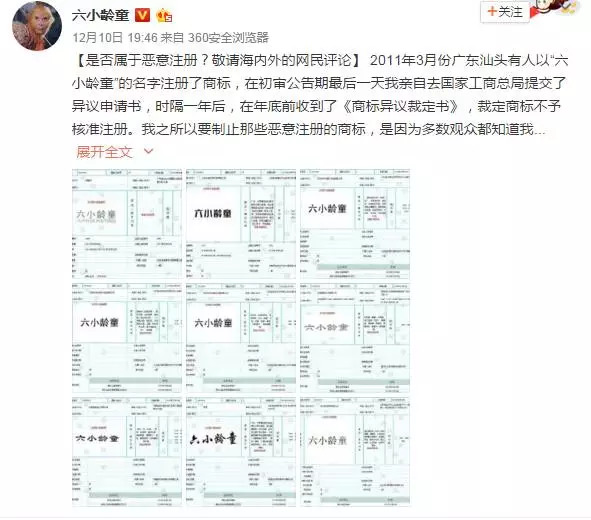 早在2016年12月,六小龄童就在微博发长文称最早在2011年,他就对恶意抢注其艺名的商标提出异议成功维权,他怒斥自己艺名被多人抢注,并晒出了自己多年前注册的不同产品及商标。