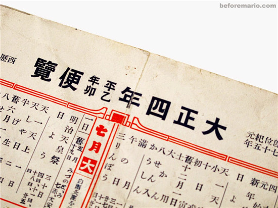 日历长24厘米,宽14厘米,正面显示的是任天堂公司的详细信息,而背面是日历。日历最上方写着的汉字“大正四年”,指的是日本大正天皇在位第四年,即1915年。所以这份日历,是名符其实的100岁高龄!