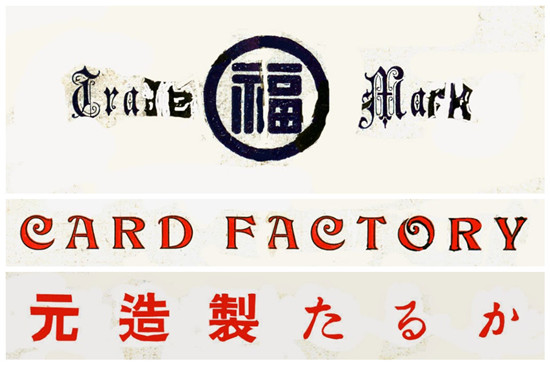 “福”字带圈是任天堂纸牌业务的商标。红色的“Card Factory”和日文“かるた制造元”,都指的是纸牌制作商。
