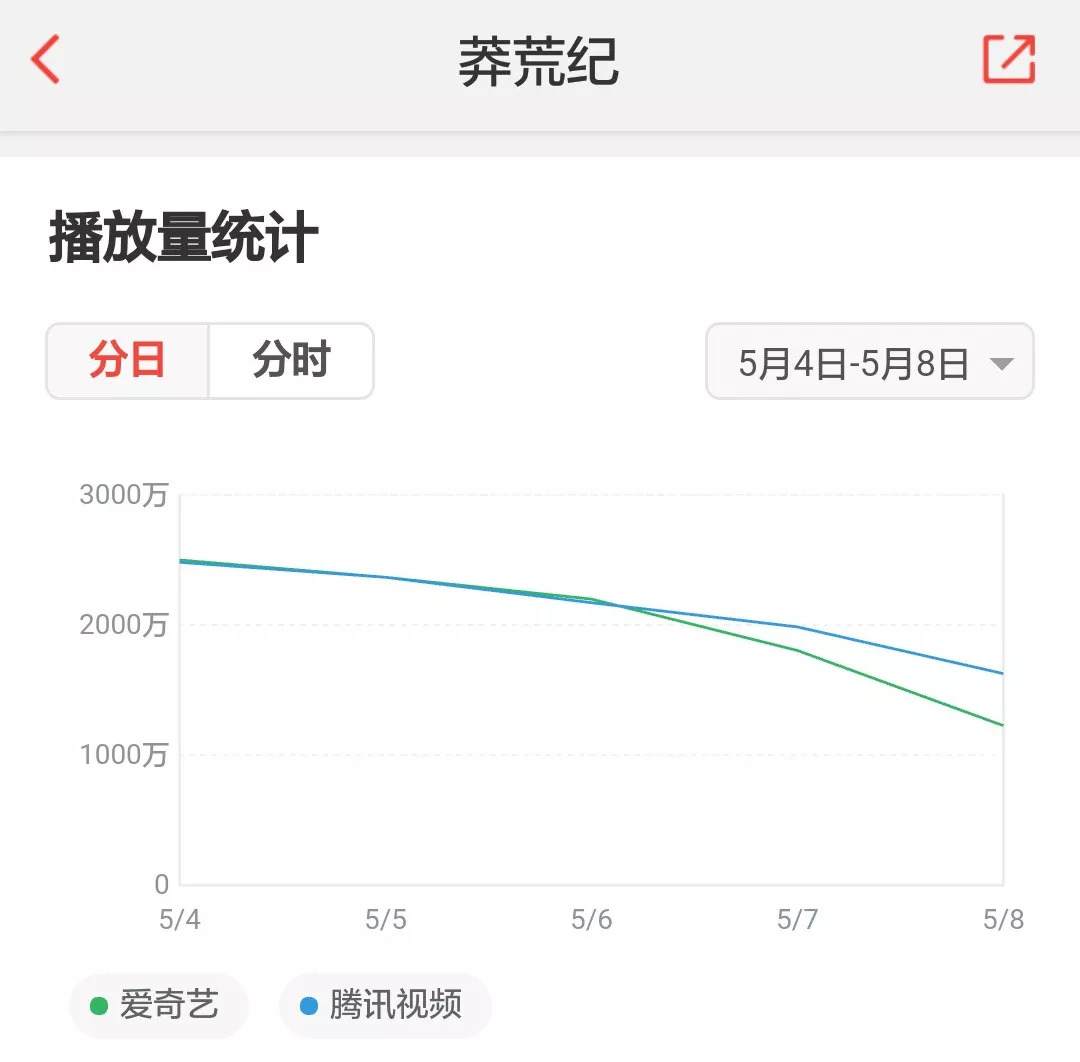 另外,《莽荒纪》的网播量累计达到4.4亿,但单日播放量下滑明显。例如在爱奇艺平台,《莽荒纪》的播放量在5月4日达到2488万,而在今日则已滑落到1510万。