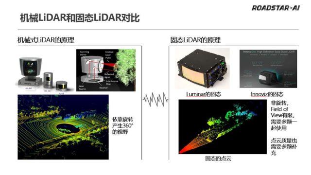 这幅图具体展现了前两代的一些代表公司。在下面的是2012年采用64线激光雷达方案的谷歌以及其他公司。上面的是最新的Waymo、Cruise、Drive.ai以及Roadstar.ai。Waymo采用了一颗高线束加6颗低线束的融合;Cruise采用了两颗32线以及两颗16线;Drive.ai采用了六颗16线;Roadstar采用了一颗32线加4颗16线的方案。