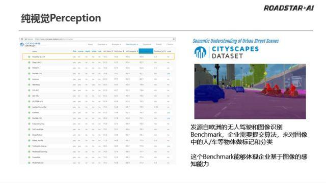 大家可以看到,Roadstar在深度学习上有非常强的功底。我们在CITYSCAPES数据集上,目前在语义分割上是排第一。我们基于单一传感器的激光雷达的感知目前在KITTI上也是居于前三。在我们前融合的内部Benchmark上,easy我们有接近99%的average precision,在Moderate和Hard基于前融合上能够达到接近90%的水平。我觉得完美的感知是无人驾驶真正实现的前提。但我也知道多数公司其实并不敢把自己的感知显示给客人看。但在Roadstar,任何过来试车的人都能看到完全跟上面视频一样的感知画面以及感知体验。