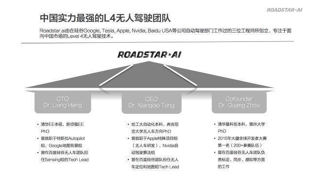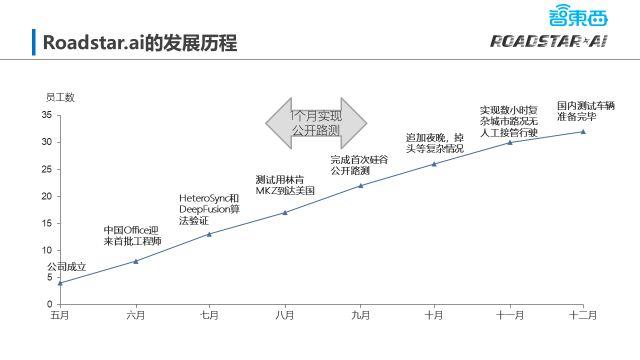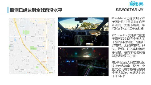 这是Roadstar的发展历程。从去年5月份成立到今天还不到一年时间,Roadstar就实现了在中美两地最复杂路况上的测试,而且我们是采用一个完全不同于第一代无人驾驶的解决方案。