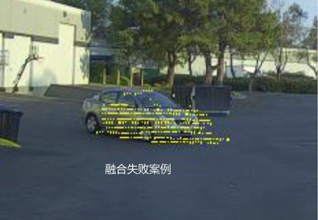 这是我们从网上搜集到另外一些无人驾驶公司融合失败的案例。大家可以看到,这个无人驾驶汽车是静止地停在一个测试场地,前面是有一个车在绕圆圈或者是八字,但是点云跟相机的信息是差了半个车头的距离,这个误差是随着距离呈线性增加的。目前这个距离大概是十米,可以想象在100米或者50米开外的时候,车和车已经是完全分离的。因此,这种融合效果是不能为系统增加额外的可靠性以及稳定性的。
